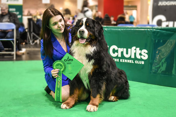 Das größte Hilight erlebte ich im Frühjahr 2023, ich fuhr zur Crufts nach Birmingham in England. Da lief ich mit vielen Bernerrüden und mit meiner Ziehmama Linda Prochazkova auf den 4. Platz.